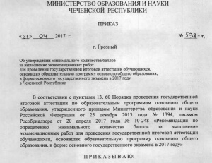 21 апреля вышел приказ МОиН ЧР №598-п "Об утверждении минимального количества баллов за выполнение экзаменационных работ при проведении ГИА обучающихся, освоивших ОП ООО, в форме ОГЭ в 2017 году в ЧР".