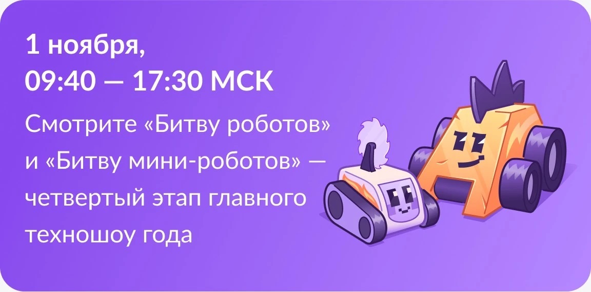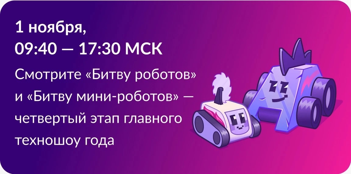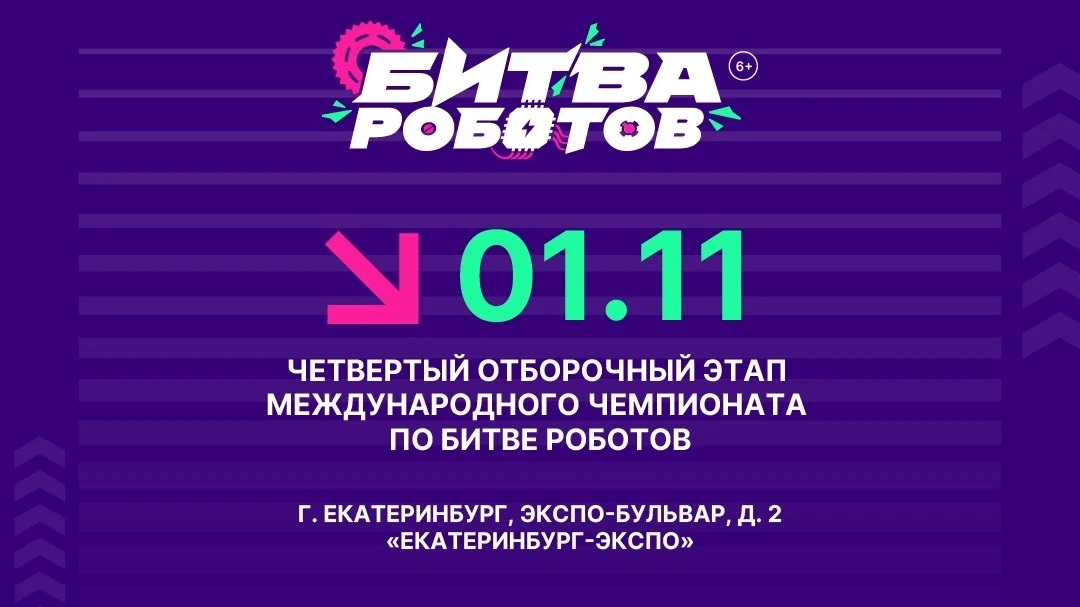 28.10.2025Четвертый отборочный этап «Битвы роботов 2025» состоится в Екатеринбурге Когда: 1 ноября 2025 г. Где: МВЦ «Екатеринбург-Экспо», г. Екатеринбург Традиционно, в отборочном этапе участвуют 16 команд в категории 110 кг и 12 команд в категории до 1,5 кг. Восемь из них пройдут в Финал! БИЛЕТЫ УЖЕ В ПРОДАЖЕ ПО ССЫЛКЕ: 683462c1e2fc26723677efcf.ticketscloud.org/? utm_sourc... Среди участников - команды из Москвы и Московской области, Камчатского края и Татарстана, Пермского края и Удмуртии, Новосибирской, Ростовской, Тюменской областей, Санкт-Петербурга, а также Беларуси, Индии и Китая. Прямая трансляция четвертого этапа пройдет по ссылке: Подписывайтесь на канал чемпионата по битве роботов в MAX max.ru/bitvarobotov