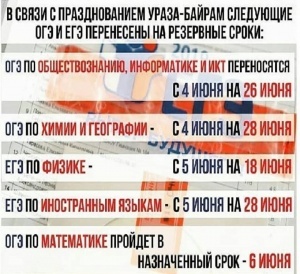 РОСОБРНАДЗОР В СВЯЗИ С ПРАЗДНОВАНИЕМ ПРАЗДНИКА УРАЗА-БАЙРАМ, ДАЛ ПРАВО ПЕРЕНЕСТИ ЭКЗАМЕНЫ, ВЫПАДАЮЩИЕ НА 4-6 ИЮНЯ, НА РЕЗЕРВНЫЕ СРОКИ.