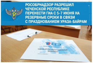 Федеральная служба по надзору в сфере образования и науки разрешила Чеченской Республике перенести экзамены с 5-7 июня на резервные сроки в связи с празднованием в республике мусульманского праздника Ураза- байрам, который знаменует окончание священного месяца поста Рамадан. В список регионов, которым разрешили перенести ЕГЭ также вошли Республики Ингушетия и Дагестан.Таким образом на резервные дни переносятся Единый государственный экзамен по иностранному языку (письменный и устный) и экзамен по физике, а также ОГЭ по математике.